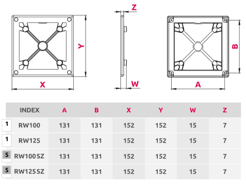 Ramki służą do stworzenia własnej aranżacji kratki wentylacyjnej, wykorzystując do tego celu panele frontowe. Ramki mają wymiar typowego otworu wentylacyjnego. Dostępne są wersje bez kołnierza (RW) jak również z kołnierzem o średnicy Ø100 oraz Ø125 mm (RWO). Ramki oferowane są w kolorze białym i szarym, standardowo wyposażone w siatkę przeciw insektom.